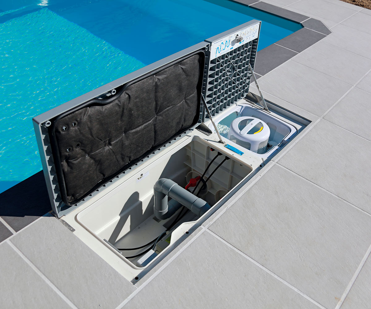 A typical example of a Desjoyaux pool that includes a pipe-free filtration mechanism and our Proprietary Active Permanent Casing structure
